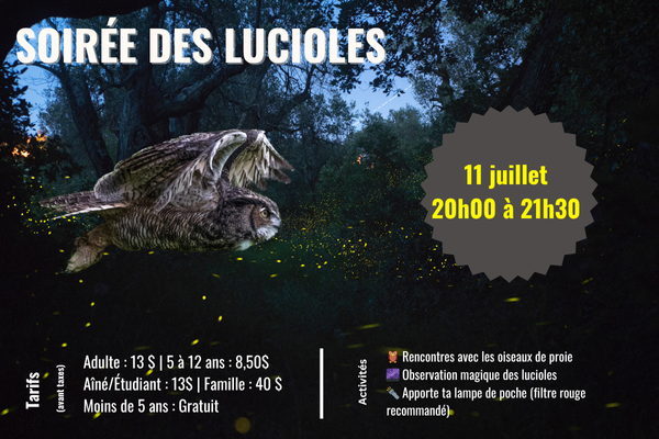 Chouette à voir! invites you again to experience a magical moment under the stars. On July 11, from 19:30 to 21:30, the 2nd edition of the night dedicated to fireflies will take place!