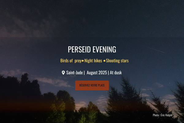 Join us for two unforgettable evenings when shooting stars and nocturnal birds share the Saint-Jude sky! During this unique event, Chouette à voir! opens its doors to you after sunset for an immersive experience between astronomy and nature under a beautiful starry sky far from the city lights.